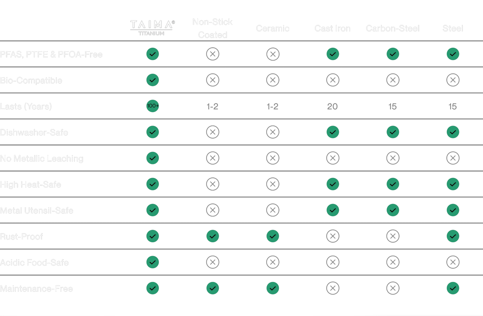 ✅ Taima® Titanium: indestructible, resistant to extreme heat up to 1150°F, and won’t warp, scratch, or corrode. Lasts a lifetime with no degradation of performance. No need for seasoning or special care. The safest, most durable cookware that stays like new.