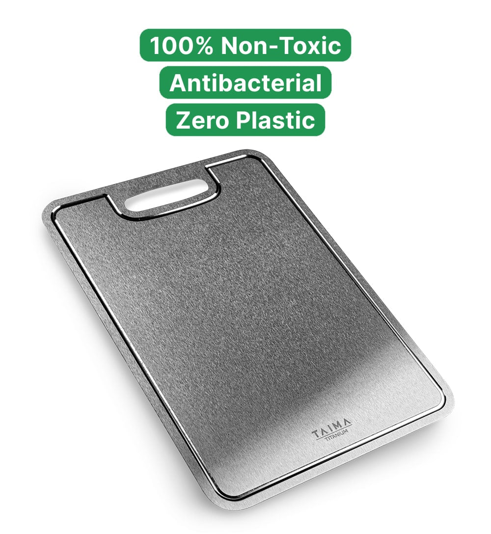 Taima’s Titanium Cutting Board is the only non-toxic, naturally antibacterial surface that doesn't release any chemicals. (It will never shed toxins, soak up germs, grow mold or rust)