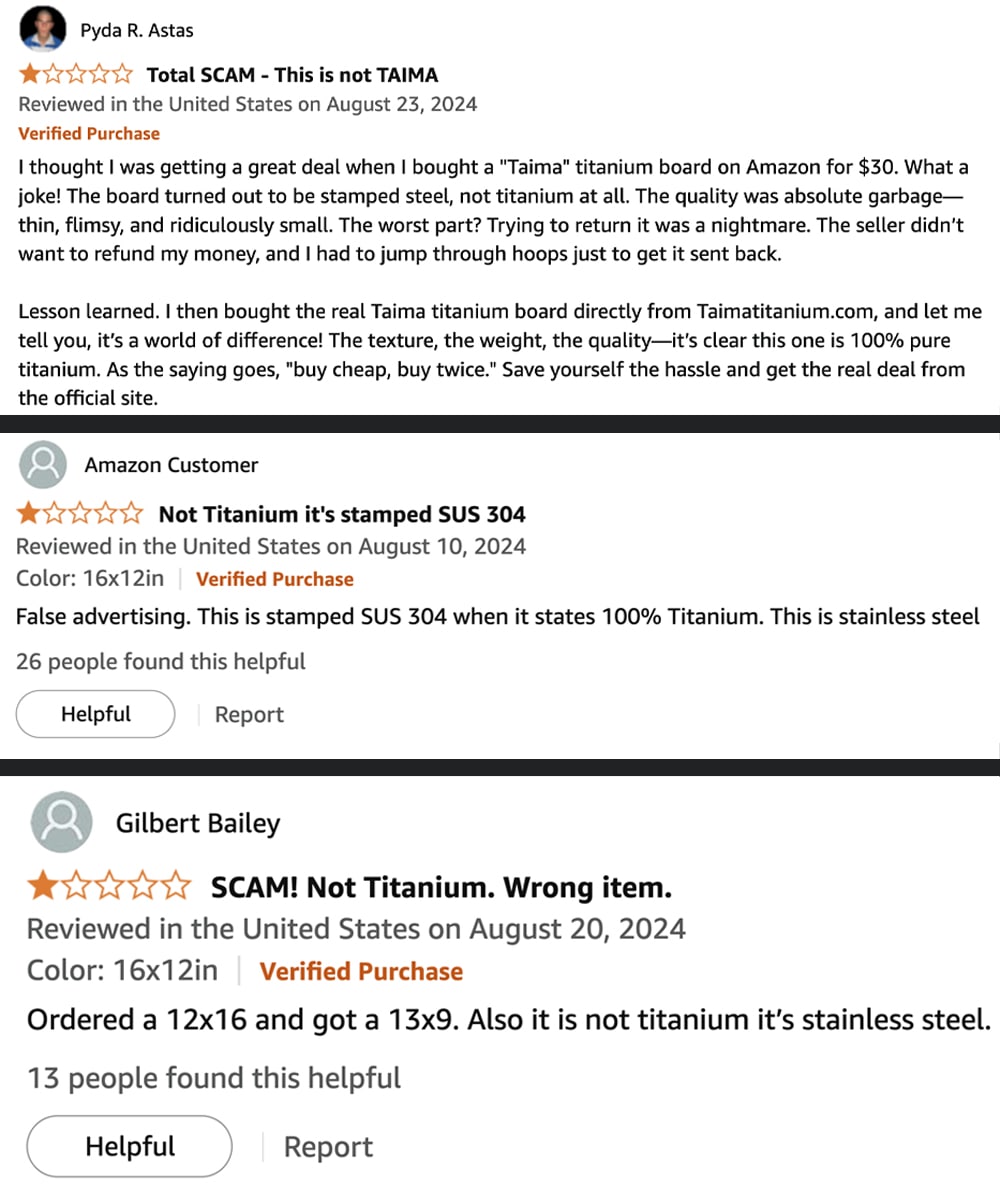 This is the only site selling official 100% pure titanium cutting boards. All other companies claiming to sell "titanium" boards for cheaper are deceiving people. They send cheap, thin, small steel boards…
